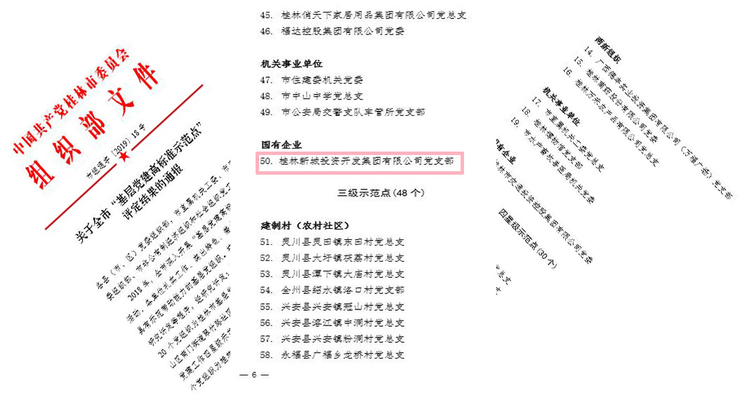 2018年,桂林市深入開展 “基層黨建高標(biāo)準(zhǔn)示范點”創(chuàng)建活動,各單位扎實工作、突出特色、著力打造,形成了一批具有示范帶動能力的基層黨組織,新城投資集團黨支部被評為“桂林市基層黨建工作四星級示范點”。
