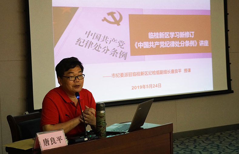 5月24日上午,臨桂新區(qū)舉辦《中國共產(chǎn)黨紀律處分條例》輔導講座。邀請市紀委派駐臨桂新區(qū)紀檢組副組長唐良平同志作《中國共產(chǎn)黨紀律處分條例》輔導報告。臨桂新區(qū)工委副書記、管委會副主任唐標明,臨桂新區(qū)工委委員、管委會副主任陳清,臨桂新區(qū)工委委員、管委會副主任文杰,臨桂新區(qū)工委委員、管委會副主任蔣玖明,新城投資集團黨支部書記、總經(jīng)理周道林以普通黨員身份參加此次講座。臨桂新區(qū)黨總支全體黨員、預(yù)備黨員、發(fā)展對象及入黨積極分子參加學習。