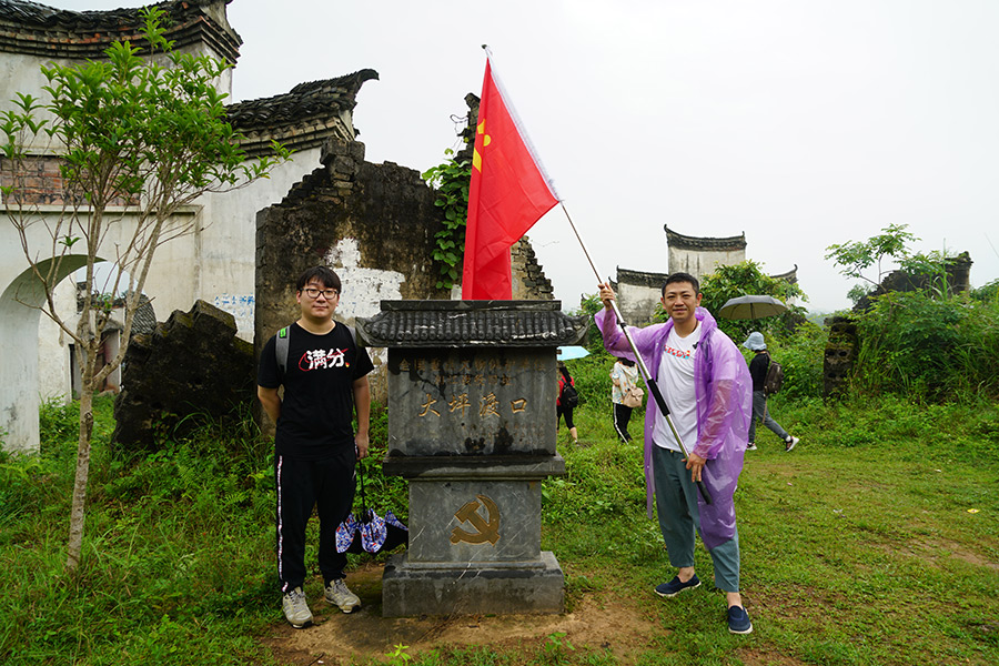 上午11點,同志們乘車到達全州縣紹水鎮(zhèn)下宅村,整裝齊隊,高舉黨旗,踏上了尋訪當(dāng)年紅軍長征足跡,緬懷革命先烈的紅色之旅。行進中,天空下著瓢潑大雨,同志們一邊行軍,一邊唱紅歌,一邊品讀著紅軍長征的艱辛。