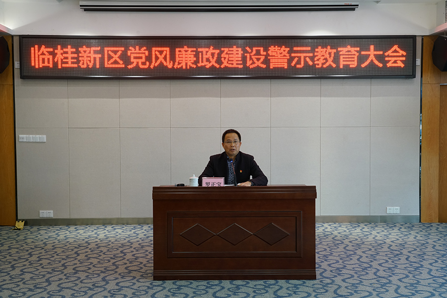 會(huì)上,羅正寶領(lǐng)學(xué)了《國有企業(yè)領(lǐng)導(dǎo)干部廉潔自律有關(guān)規(guī)定》,講解了《中國共產(chǎn)黨問責(zé)條例》。他指出,臨桂新區(qū)黨風(fēng)廉政建設(shè)警示教育大會(huì)的召開,是開展“不忘初心、牢記使命”主題教育的重要一環(huán)。國有企業(yè)廣大黨員干部要按照主題教育“清正廉潔作表率”的目標(biāo)要求,把加強(qiáng)紀(jì)律作風(fēng)建設(shè)工作擺在重要位置,進(jìn)一步加強(qiáng)黨風(fēng)廉政建設(shè),堅(jiān)持依規(guī)用權(quán),帶頭接受監(jiān)督,嚴(yán)格按照民主集中制和“三重一大”議事規(guī)則來議事、來決策、來辦事。要進(jìn)一步強(qiáng)化廉潔意識(shí),嚴(yán)格修身自律,守好人生、家庭和事業(yè)的“底線”, 著力錘煉忠誠干凈擔(dān)當(dāng)?shù)恼纹犯?,不斷開創(chuàng)臨桂新區(qū)全面從嚴(yán)治黨和黨風(fēng)廉政建設(shè)新局面。