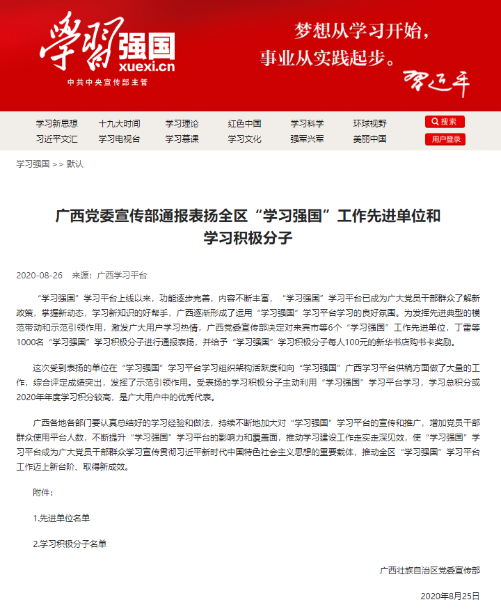 附:《廣西黨委宣傳部通報表揚全區(qū)“學習強國”工作先進單位和學習積極分子》