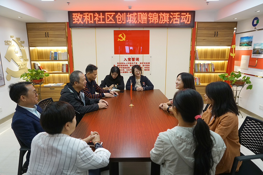 10月14日上午,臨桂區(qū)致和社區(qū)書記張妮妮一行三人將一面印有“黨旗映勝地 創(chuàng)城我先行”的錦旗交至新城投資集團黨總支書記、董事長、總經(jīng)理周道林手中,感謝新城投資集團急群眾所急,想群眾所想,舉全力為社區(qū)、為群眾解難題、辦難事。