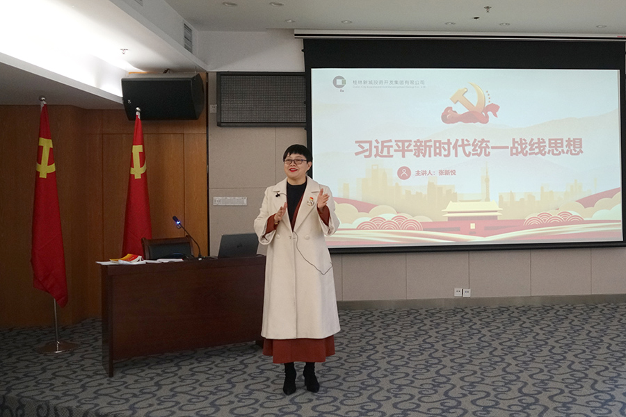 2020年12月31日,桂林新城投資集團黨總支統(tǒng)戰(zhàn)委員張新悅以“習(xí)近平新時代統(tǒng)一戰(zhàn)線思想”為主題,給集團公司第二黨支部黨員、發(fā)展對象、入黨積極分子,分管部室、子公司負(fù)責(zé)人上了一堂專題黨課。