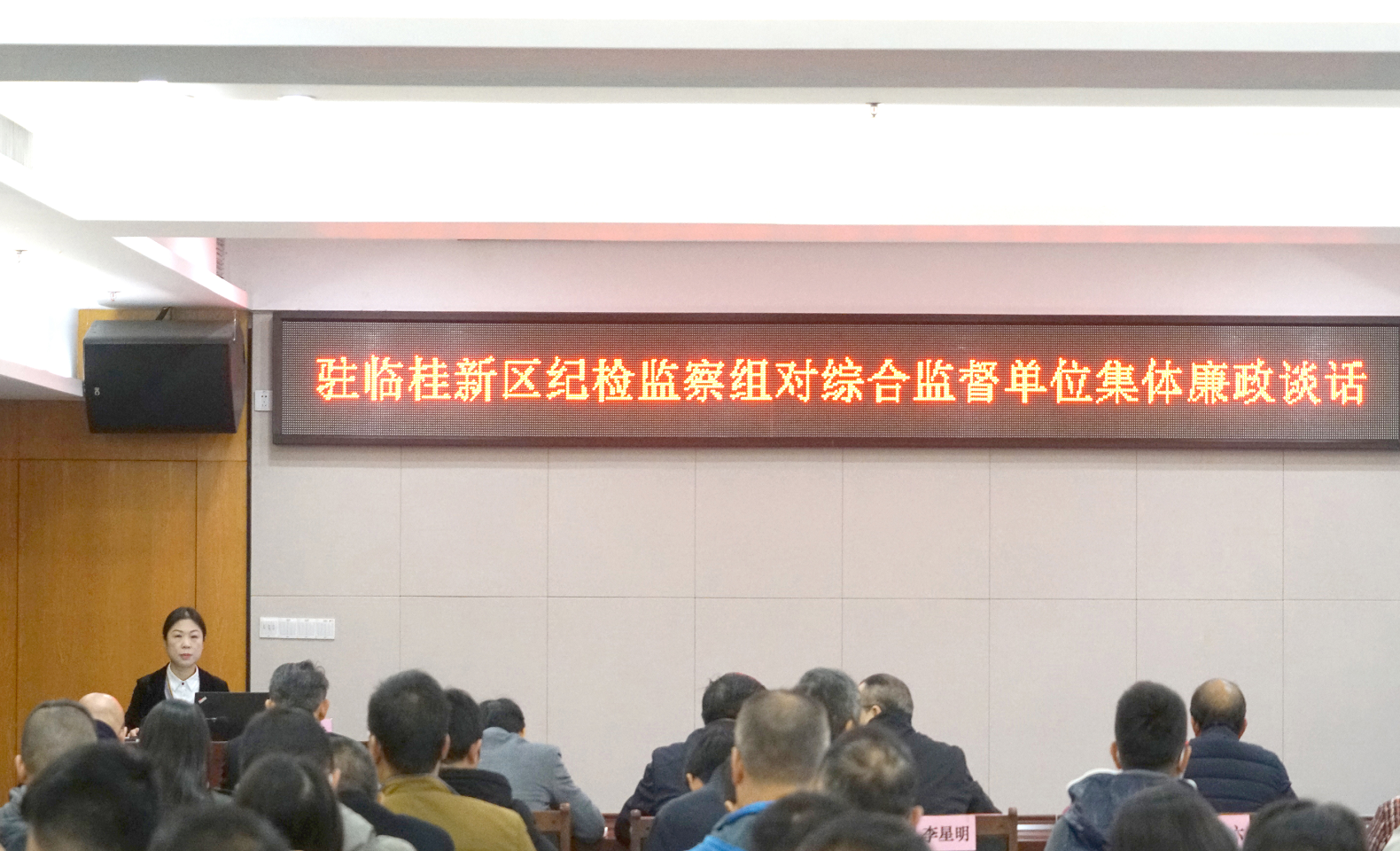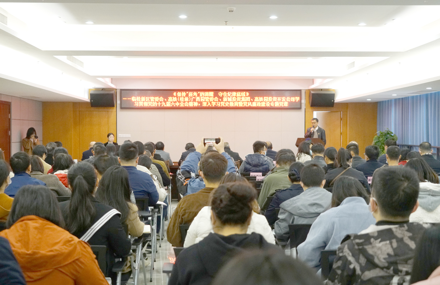 為深入貫徹落實全面從嚴治黨要求,進一步推進黨風(fēng)廉政建設(shè)和反腐敗工作深入開展,增強黨員干部廉潔自律意識和拒腐防變能力,11月25日,市紀委監(jiān)察委駐臨桂新區(qū)管委會紀檢監(jiān)察組組長、臨桂新區(qū)黨工委委員石安蘭在新城投資集團十樓會議室開展綜合監(jiān)督單位集體廉政談話暨《保持“趕考”的清醒 守住紀律底線》專題黨課。市紀委監(jiān)察委駐臨桂新區(qū)管委會紀檢監(jiān)察組副組長唐良平主持專題黨課。臨桂新區(qū)管委會、高鐵(桂林)廣西園管委會、新城投資集團、高鐵園投資公司等4家單位120多名黨員干部聆聽了黨課。