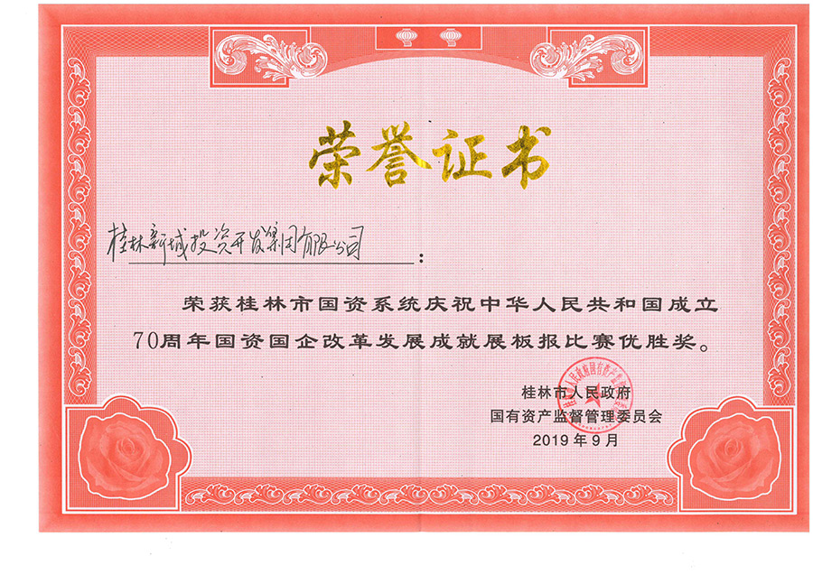 新城投資集團(tuán)黨總支選送的展板報(bào)作品在市國(guó)資委主辦桂林市國(guó)資系統(tǒng)慶祝中華人民共和國(guó)成立70周年國(guó)資國(guó)企改革發(fā)展成就展板報(bào)比賽中脫穎而出。9月21日晚,新城投資集團(tuán)受邀參加市國(guó)資委展板報(bào)比賽頒獎(jiǎng)儀式,工會(huì)主席譚力源代表集團(tuán)公司出席儀式并領(lǐng)獎(jiǎng)。