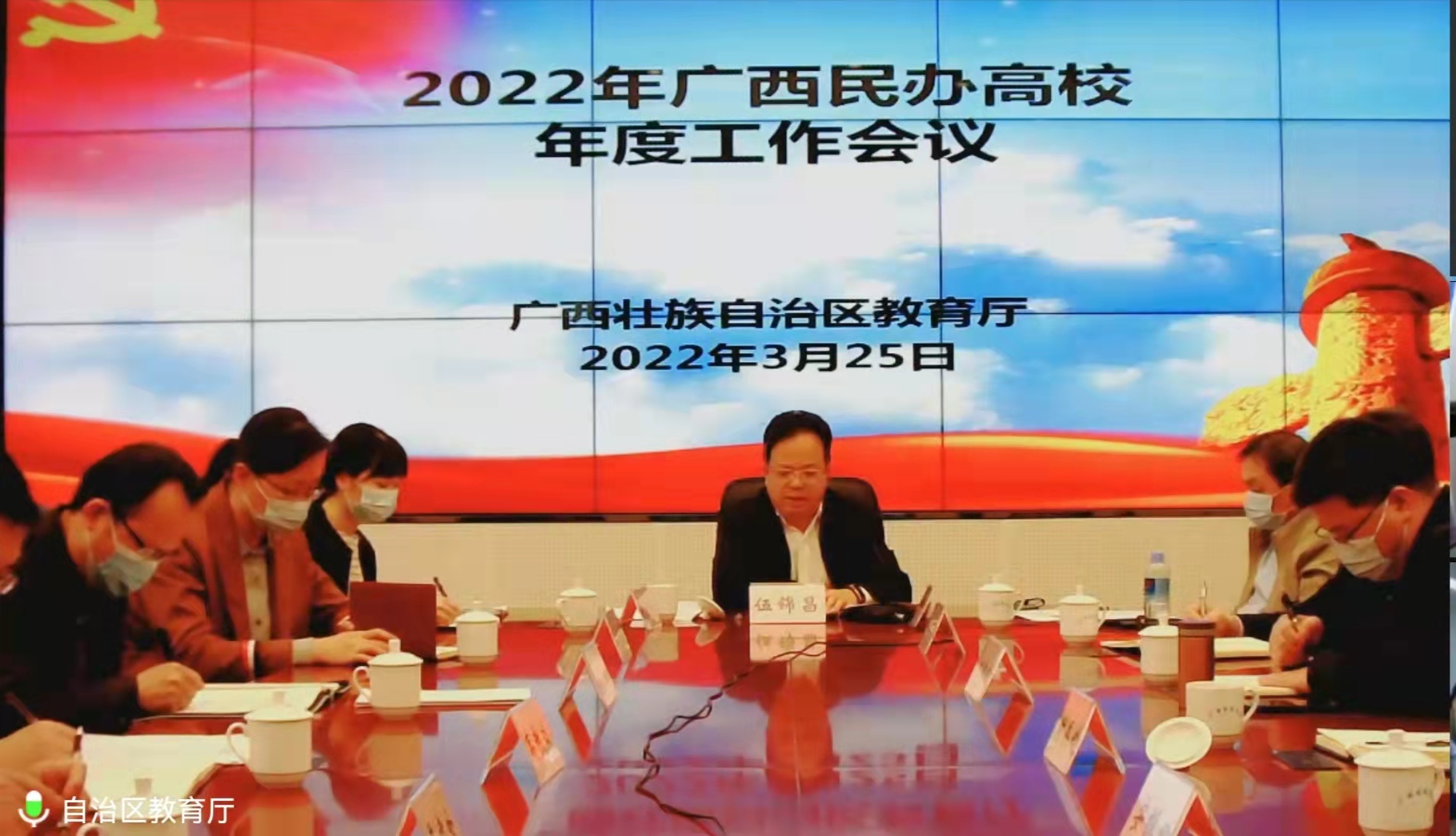 3月25日上午, 自治區(qū)教育廳召開2022年廣西民辦高校年度工作視頻會議。自治區(qū)教育廳黨組成員、副廳長伍錦昌出席會議并作重要講話,自治區(qū)教育廳民辦教育管理處處長蔣國平主持會議。桂林學(xué)院董事長周道林、副董事長鄭善華、校長楊樹喆、校黨組織書記唐文紅在各分會場參加會議。