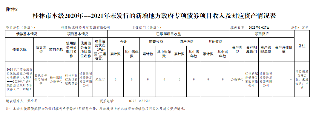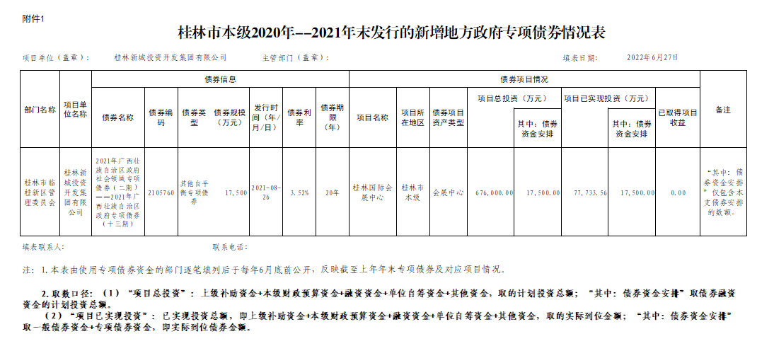 截至2021年末,桂林新城投資開發(fā)集團(tuán)有限公司獲得2020年新增政府專項(xiàng)債券資金12,000.00萬元,安排用于所屬單位1個(gè)項(xiàng)目,其中:桂林國(guó)際會(huì)展中心項(xiàng)目12,000.00萬元,從債券項(xiàng)目資產(chǎn)類型看,主要是會(huì)展中心。從項(xiàng)目實(shí)施進(jìn)度看,該項(xiàng)目總投資676,000.00萬元,其中2020年債券資金安排12,000.00萬元;截至2021年末已實(shí)現(xiàn)投資 77,733.56萬元,其中2020年債券資金安排12,000.00萬元。截至2021年末,該項(xiàng)目尚在建設(shè)期未運(yùn)營(yíng)。