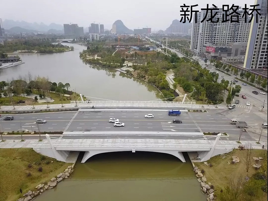 新龍路橋位于臨桂新區(qū)中心區(qū)東部,跨越臨桂新區(qū)沙溏河,橋梁中心線與河道正交,采用單跨斜腿剛構(gòu),斜腿剛構(gòu)跨徑41.282米,主梁總長56米,橋梁總寬47米,分三幅設(shè)置,沉降伸縮縫設(shè)置在機(jī)非隔離帶中間,機(jī)動車道部分橋?qū)?5米,每側(cè)人行道和非機(jī)動車部分橋?qū)?1米,橋梁與河道正交。該工程于2017年1月開工建設(shè),于2018年9月27日完成初步驗(yàn)收。新龍路橋跨越新區(qū)水系,是連接臨桂新老城區(qū)的重要橋梁,該橋梁使核心區(qū)的交通網(wǎng)絡(luò)趨于完善,標(biāo)志著臨桂新區(qū)核心區(qū)的橋梁工程基本建設(shè)完成。