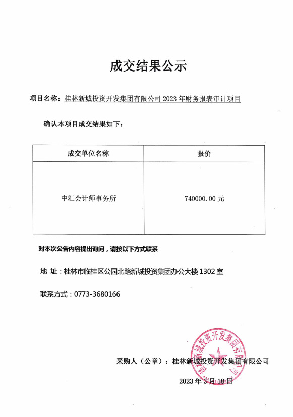 桂林新城投資開發(fā)集團(tuán)有限公司2023年財務(wù)報表審計項目成交結(jié)果公示