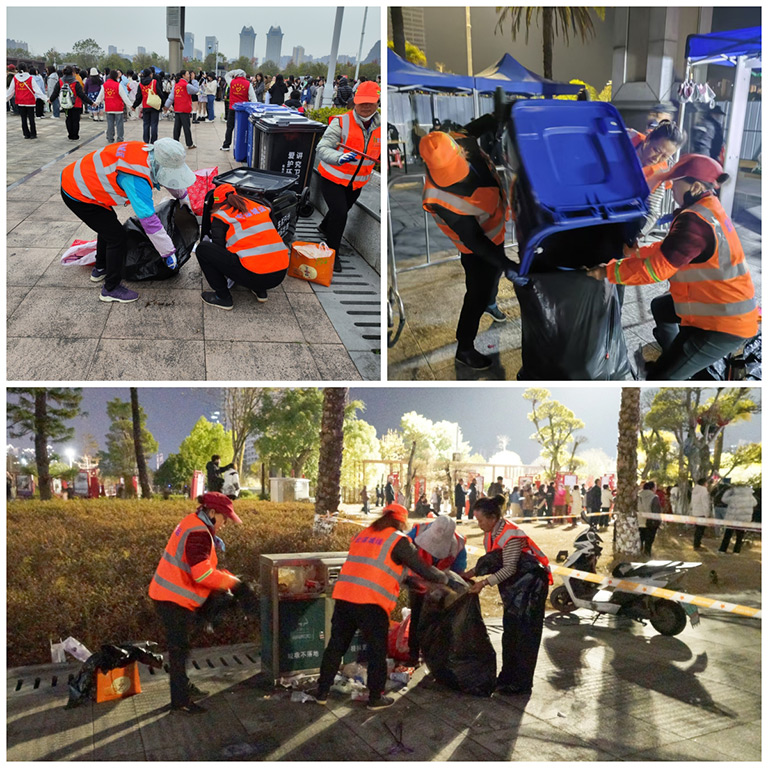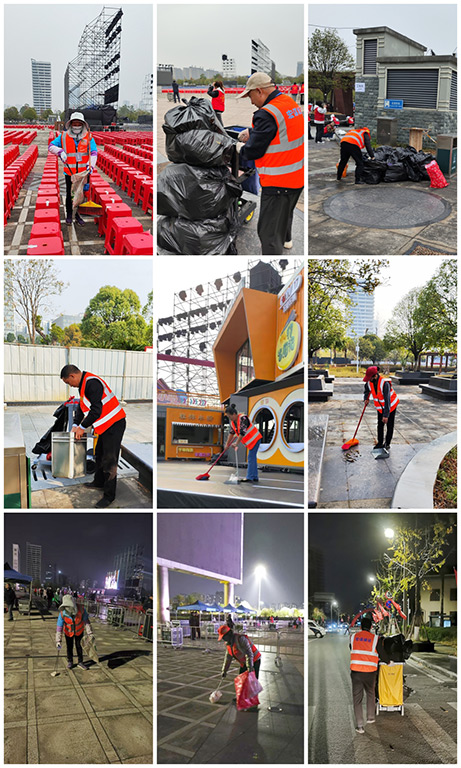 為營造整潔有序的活動氛圍,公司積極履行活動現(xiàn)場環(huán)境衛(wèi)生保障職責(zé),出動了10余名保潔人員及2臺垃圾清運(yùn)車組成“清潔衛(wèi)士”隊(duì)伍,對廣場內(nèi)的塑料飯盒、礦泉水瓶、包裝袋、發(fā)光棒、煙頭等垃圾進(jìn)行“地毯式”清理,同時對廣場周邊的28個垃圾桶進(jìn)行合理調(diào)整布局,增加垃圾清運(yùn)次數(shù),做到垃圾不堆積、不滯留?;顒赢?dāng)天,“清潔衛(wèi)士”隊(duì)伍加大清掃頻次,延長保潔時間,及時發(fā)現(xiàn)并解決環(huán)境衛(wèi)生問題,共為800名工作、安保人員及上千名觀眾清理了260余包垃圾?;顒忧昂?2天,清理枯枝落葉、舞臺垃圾等總計(jì)達(dá)5噸,確?;顒訄龅丨h(huán)境舒適與衛(wèi)生。