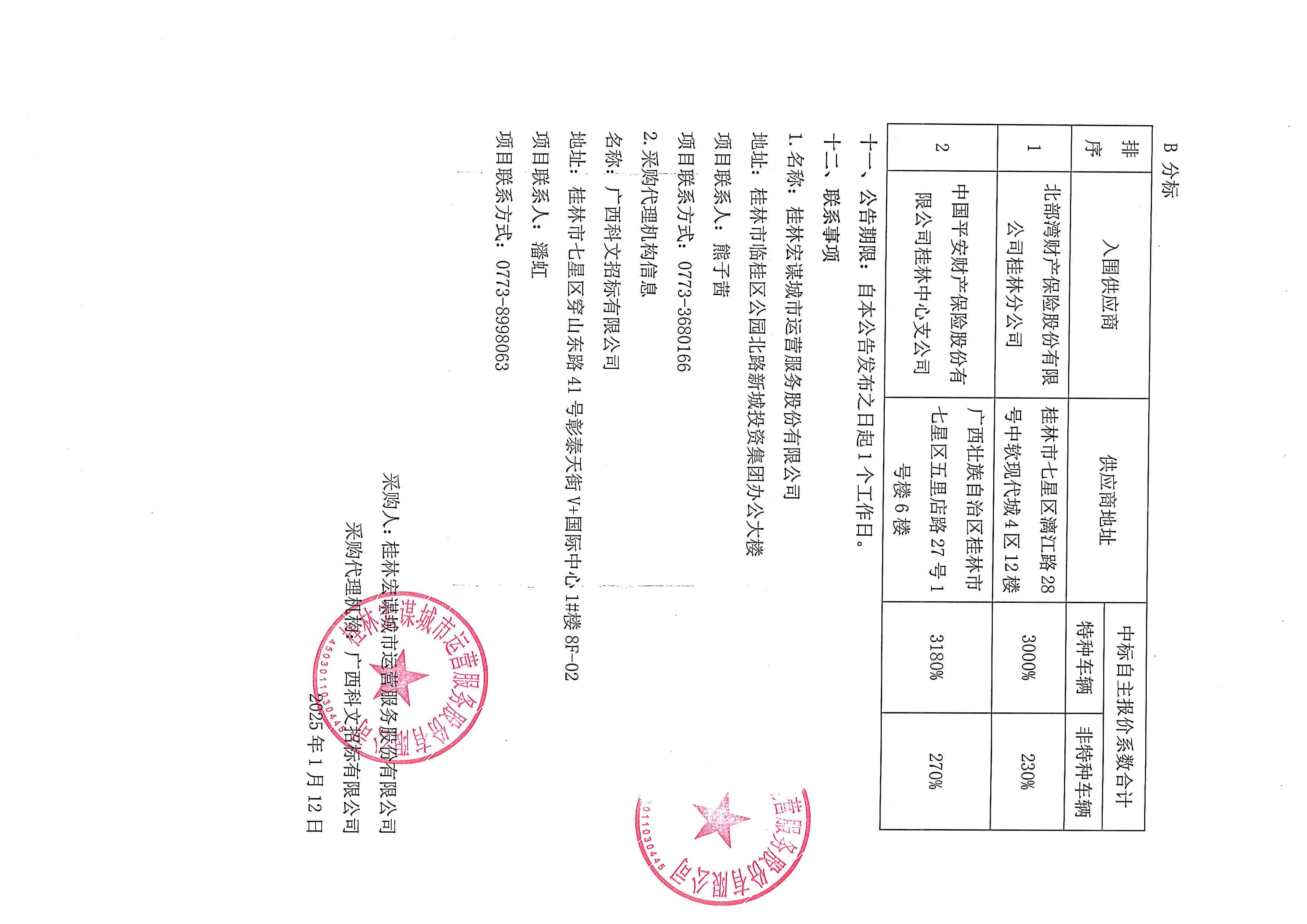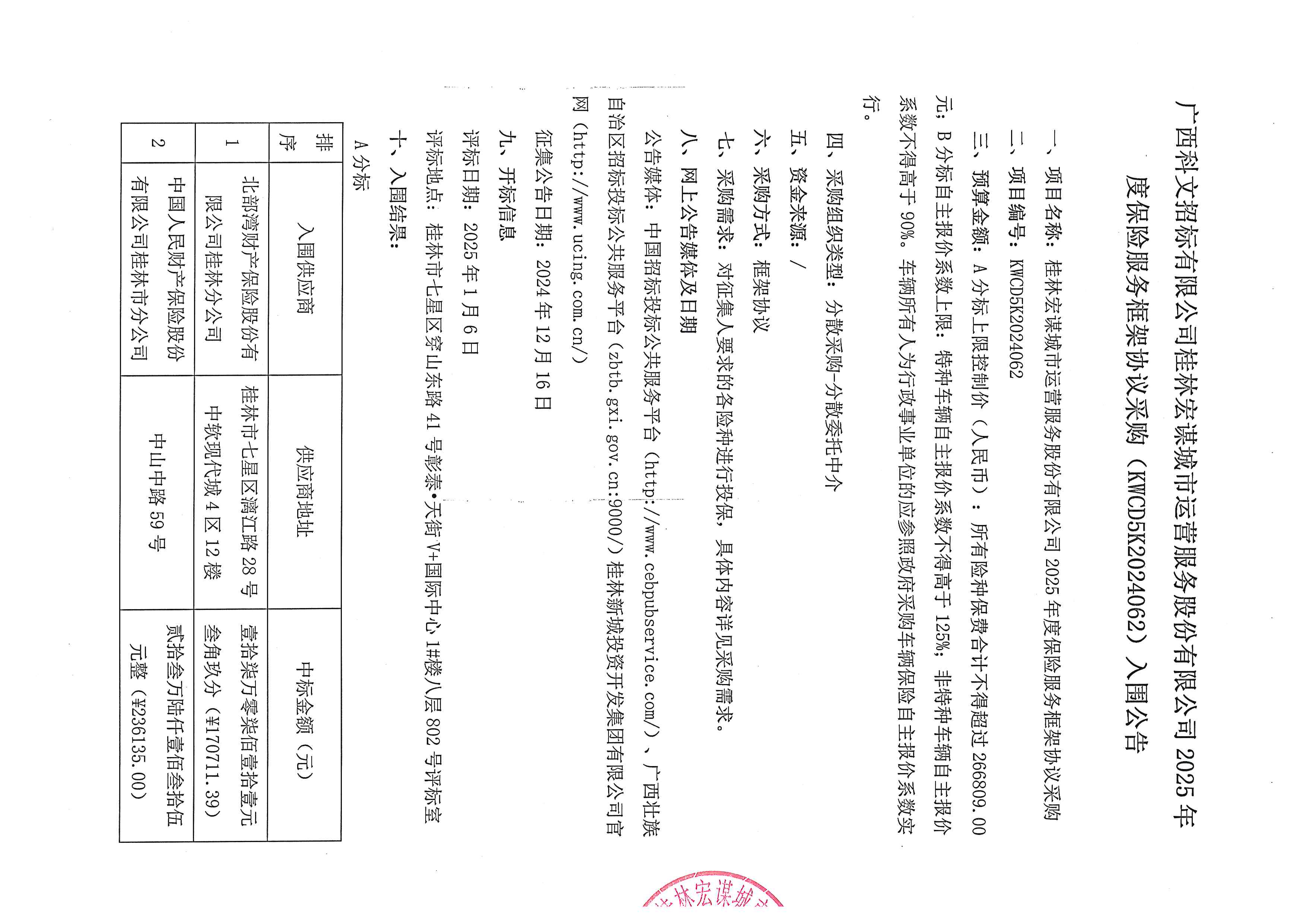 桂林宏謀城市運(yùn)營服務(wù)股份有限公司2025年度保險(xiǎn)服務(wù)框架協(xié)議采購 (KWCD5K2024062)入圍公告