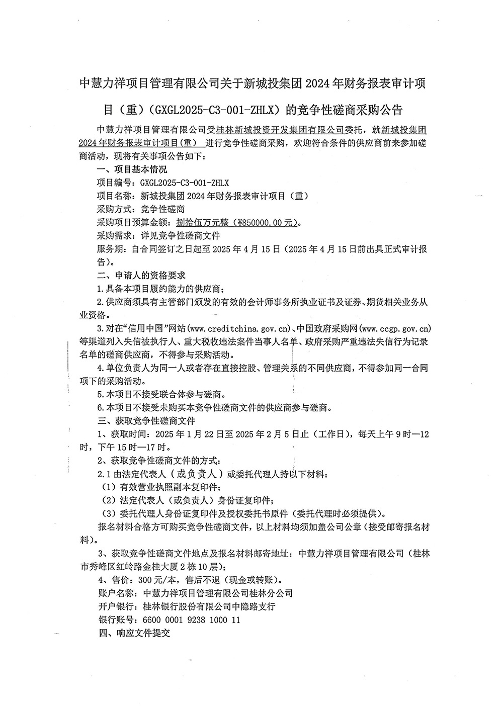 中慧力祥項(xiàng)目管理有限公司關(guān)于新城投集團(tuán)2024年財(cái)務(wù)報(bào)表審計(jì)項(xiàng)目(重)(GXGL2025-C3-001-ZHLX)的競(jìng)爭(zhēng)性磋商采購(gòu)公告