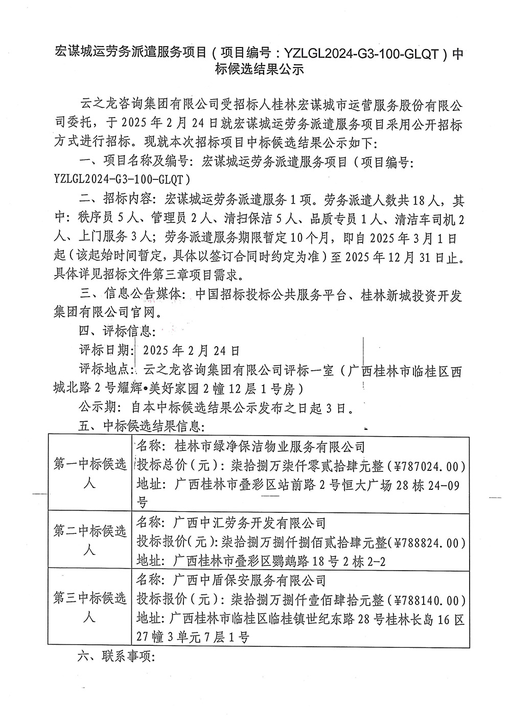 宏謀城運勞務(wù)派遣服務(wù)項目(項目編號:YZLGL2024-G3-100-GLQT)中標(biāo)候選結(jié)果公示
