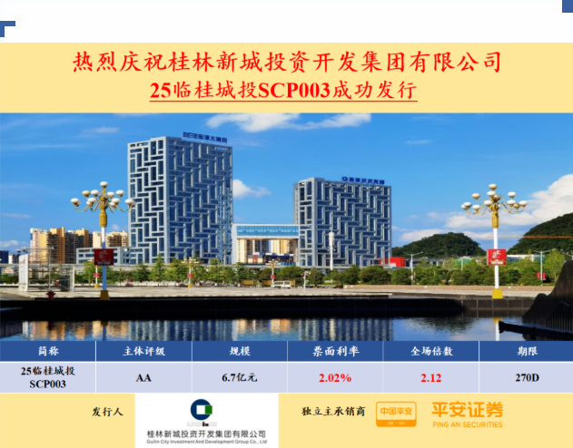 8月6日,桂林新城投資開(kāi)發(fā)集團(tuán)有限公司成功發(fā)行2025年度第三期超短期融資券,規(guī)模6.7億元,票面利率2.02%,認(rèn)購(gòu)倍數(shù)2.12倍,本期超短融由平安證券獨(dú)立承銷。此次成功發(fā)行超短融利率僅次于2025年度第二期超短融創(chuàng)下的“桂林市有史以來(lái)信用債發(fā)行的最低利率2.01%”!
